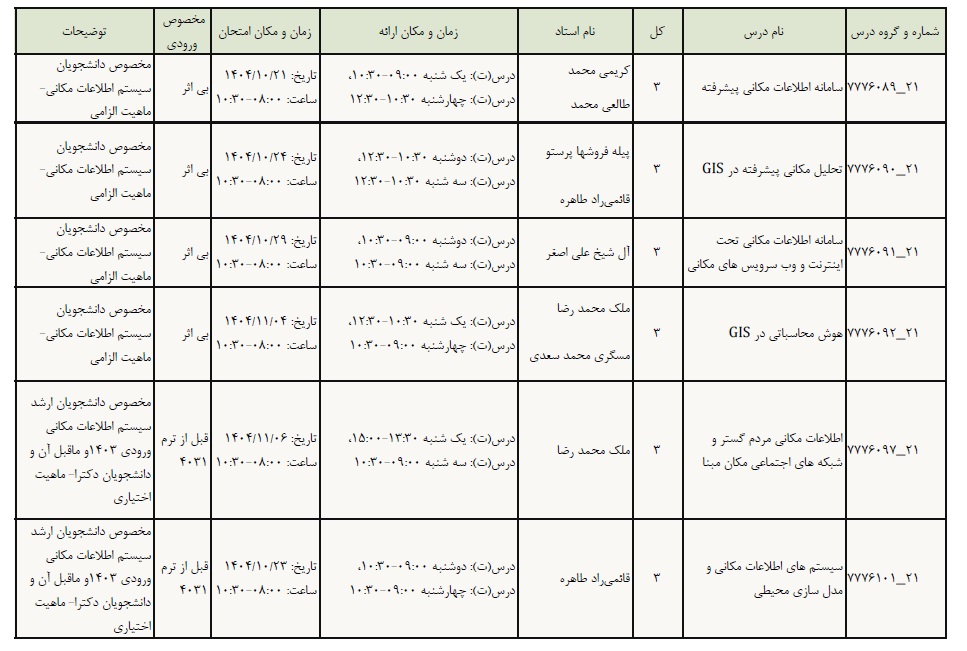 دروس ارایه شده ترم جاری گروه سیستم اطلاعات مکانی در نیمسال اول 4041